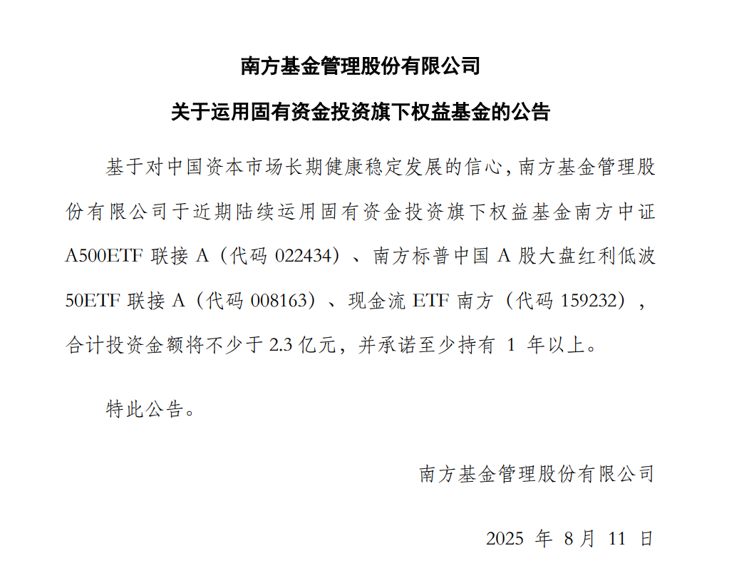 上证报中国证券网讯(记者 何漪)8月10日晚间,现款流ETF南边发布公告称,基于对中国老本商场恒久健康相识发展的信心,南边基金于近期继续把握固有资金投资旗下权力基金南边中证A500ETF连合A(代码022434)、南边标普中国A股大盘红利低波50ETF连合A(代码008163)、现款流ETF南边(代码159232),共计投资金额将不少于2.3亿元,并痛快至少握有1年以上。